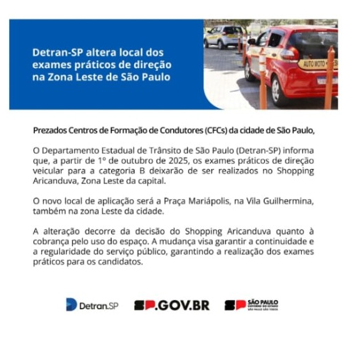 O Departamento Estadual de Trânsito de São Paulo (Detran.SP) divulgou comunicado aos Centros de Formação de Condutores (CFCs) da Capital informando que, a partir do dia 1º de outubro de 2025, os exames práticos de direção veicular para a categoria B não serão mais realizados no Shopping Aricanduva, na Zona Leste de São Paulo.