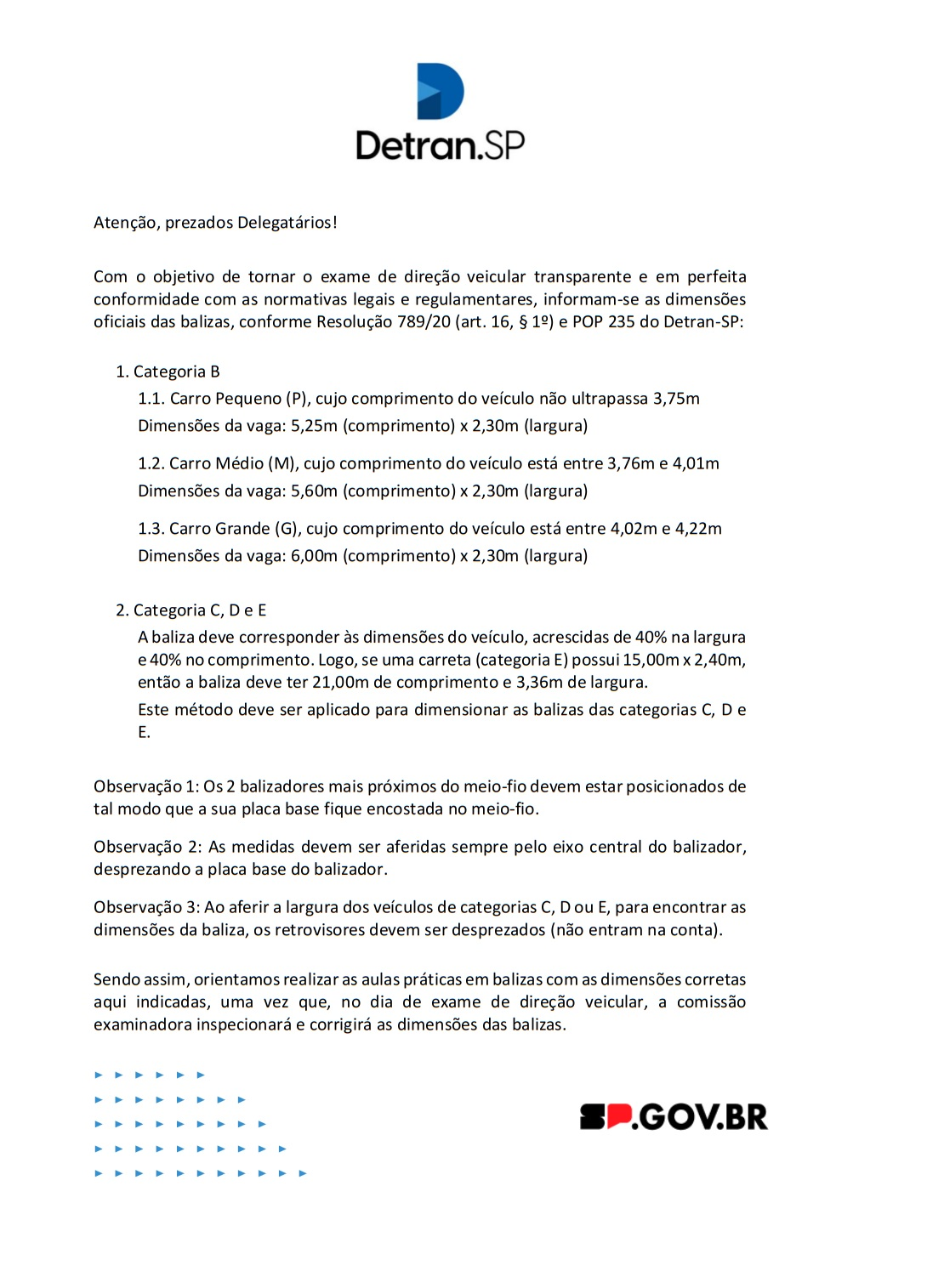 O Detran.SP também alerta que, no dia do exame prático, as comissões examinadoras irão verificar e corrigir eventuais inconsistências nas dimensões das balizas.